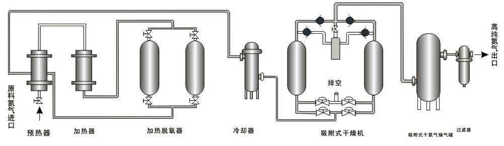 Under the action of Catalyst, the chemical reaction is complete and the content of residual oxygen in nitrogen after deoxidation is less than 3 ppm. The deoxidized nitrogen is cooled and enters the adsorber with molecular sieve. The moisture and CO2 in nitrogen are deeply adsorbed by molecular sieve. After filtration, high purity nitrogen can be obtained. The advantages of the process are that there is no hydrogen content in the product nitrogen, and it is especially suitable for the occasions where the hydrogen content is strictly required.