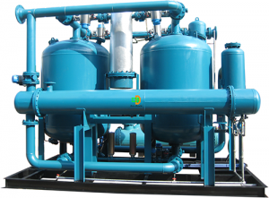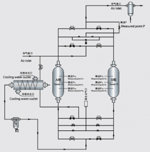 In the compression heating process, the high-temperature and high-pressure gas first enters the regeneration tower of the drying device, causing the adsorbent to heat up and desorb. Then the humid and hot compressed air is cooled to room temperature by the rear cooler, removing a large amount of moisture, and finally enters the adsorption tower for drying, meeting the requirement of a dew point below -40 ℃. After the regeneration heating stage of the regeneration tower is completed, the equipment switches to the cold blowing stage. The cold blowing stage is to use gas that has been treated by a first stage post cooling and separator to cool and blow to the required room temperature for adsorption, and achieve a high degree of drying until regeneration is completed, waiting for the start of the next adsorption cycle.