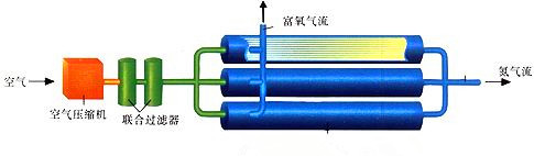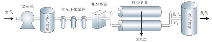 The system consists of a Air compressor, a filter and a membrane separator through which the Compressed air enters the membrane separator, oxygen, water vapor and a small amount of carbon dioxide gas in the air were enriched rapidly through the membrane wall to the other side of the membrane. The outlet pressure of the enriched nitrogen is almost the same as that of the Compressed air when it enters the membrane system, and the power loss is very small.