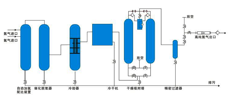This series of equipment adopts the method of catalytic deoxidation + adsorption drying to remove impurities such as oxygen, water, carbon dioxide and dust in nitrogen to obtain high purity nitrogen. After static mixing, the nitrogen and the added hydrogen enter the heat exchanger, and the inlet gas is preheated by the heat from the outlet of the deaerator, and then enters the deaerator equipped with an efficient hydrodeoxidation catalyst, the impurities of oxygen in nitrogen react with hydrogen to produce water, and at the same time give off a lot of heat, which can form a temperature of about 200 ° C when reacting with 1% oxygen content. Then through the heat exchanger, and then into the dry filter to remove water, carbon dioxide and dust particles and other impurities, thus obtaining high-purity nitrogen.
